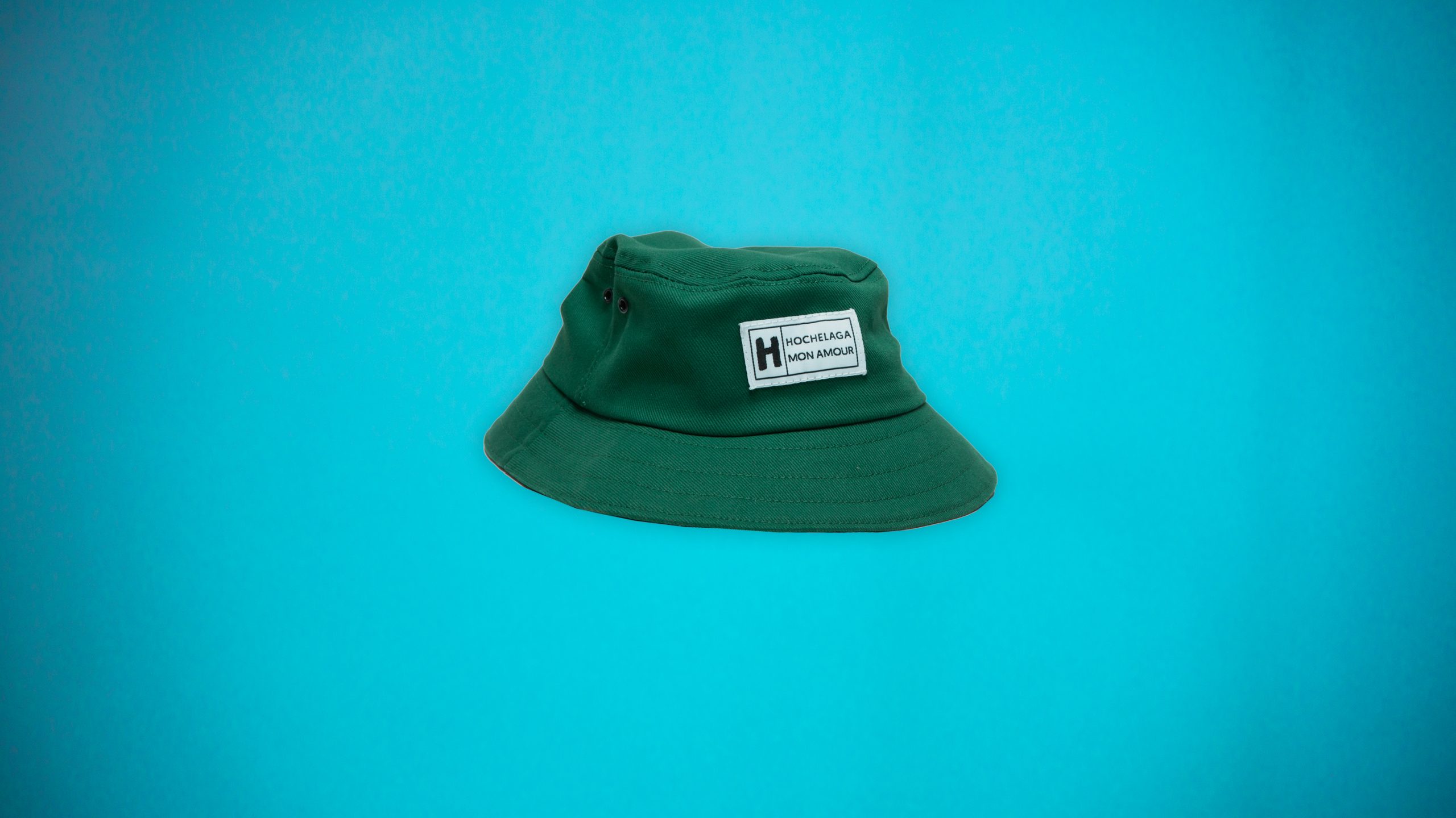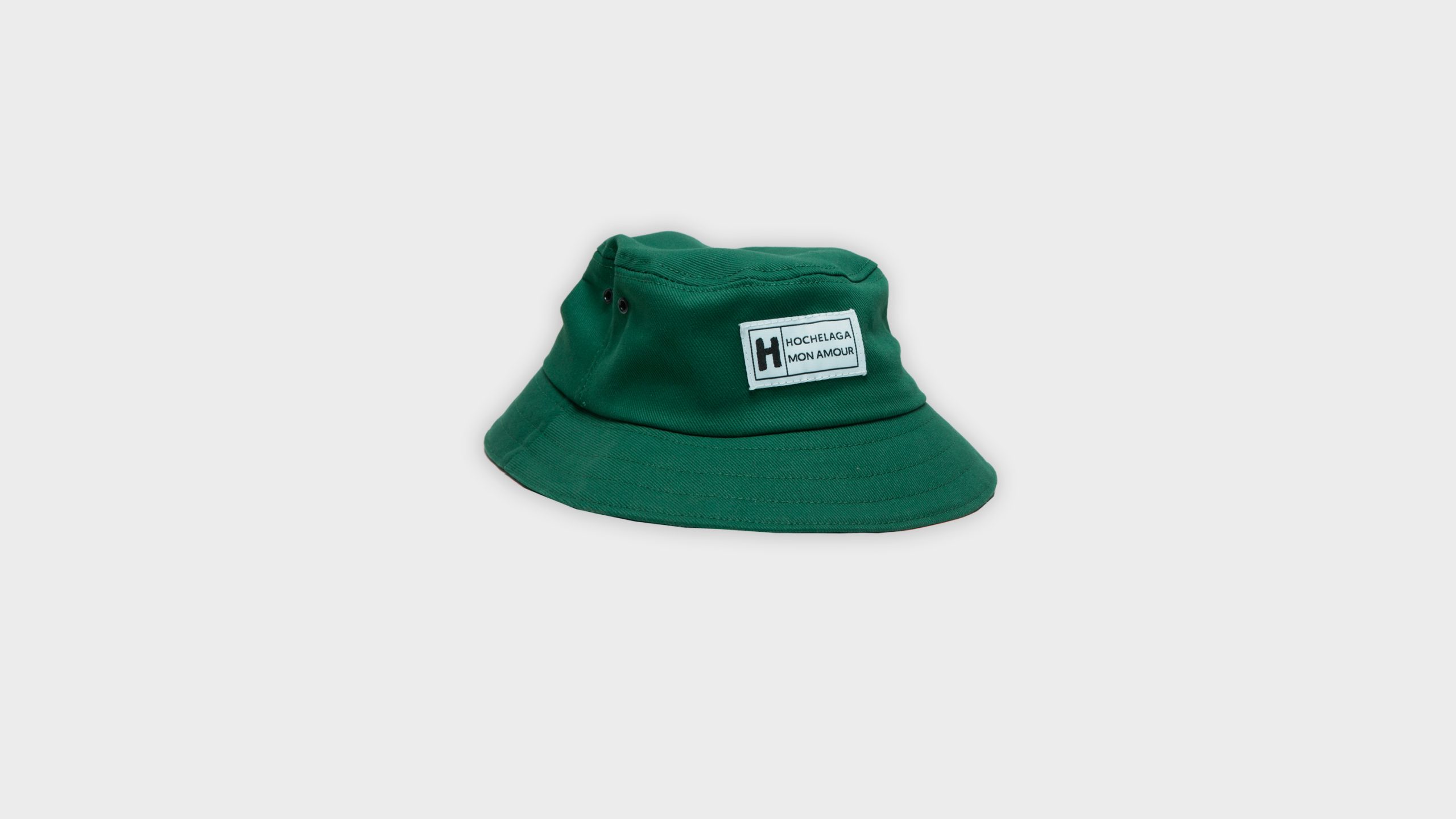 Chapeau de type « bucket hat », pour enfants, vert en coton avec logo Hochelaga – Mon amour centré à l’avanté
