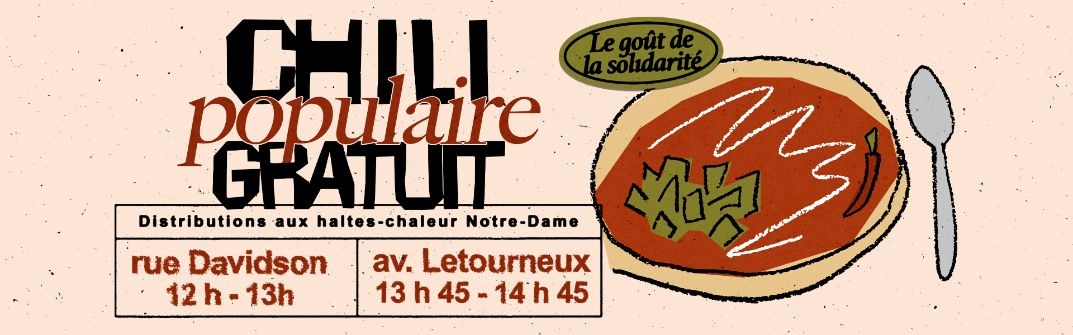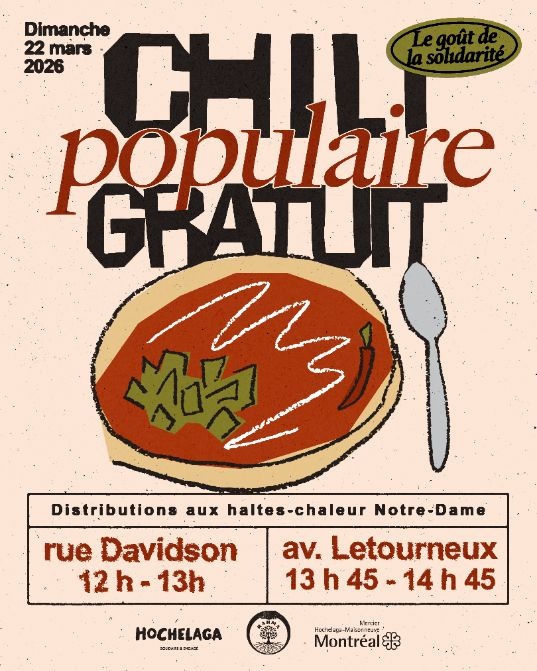 Afin d’apporter un peu de chaleur et de réconfort aux personnes qui en ont besoin, et ce, en cette fin de saison hivernale, nous lançons une initiative chaleureuse en partenariat avec le RAHMA – Réseau Alimentation Hochelaga-Maisonneuve en Action . Le dimanche 22 mars, entre 12 h et 14 h 45, nous procéderons à la distribution de plus d’une centaine de portions de chili végétarien dans les deux haltes-chaleur situées sur la rue Notre-Dame Est. Nous avons choisi cette date, car une grande majorité des ressources et des banques alimentaires sont fermées le dimanche.